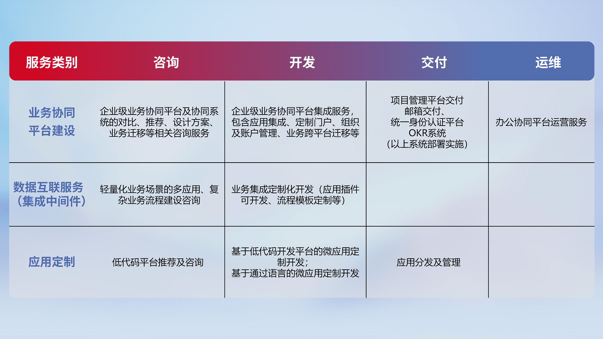 针对钉钉、、、、企微、、、IDaas等平台级产品提供产品的规划、、、方案、、交付、、、、定制化开发等服务,,,,实现如统一协同办公、、智能客户服务、、混合会议管理、、、、智能数据查询、、、、等业务场景,,实现数字化转型。。。